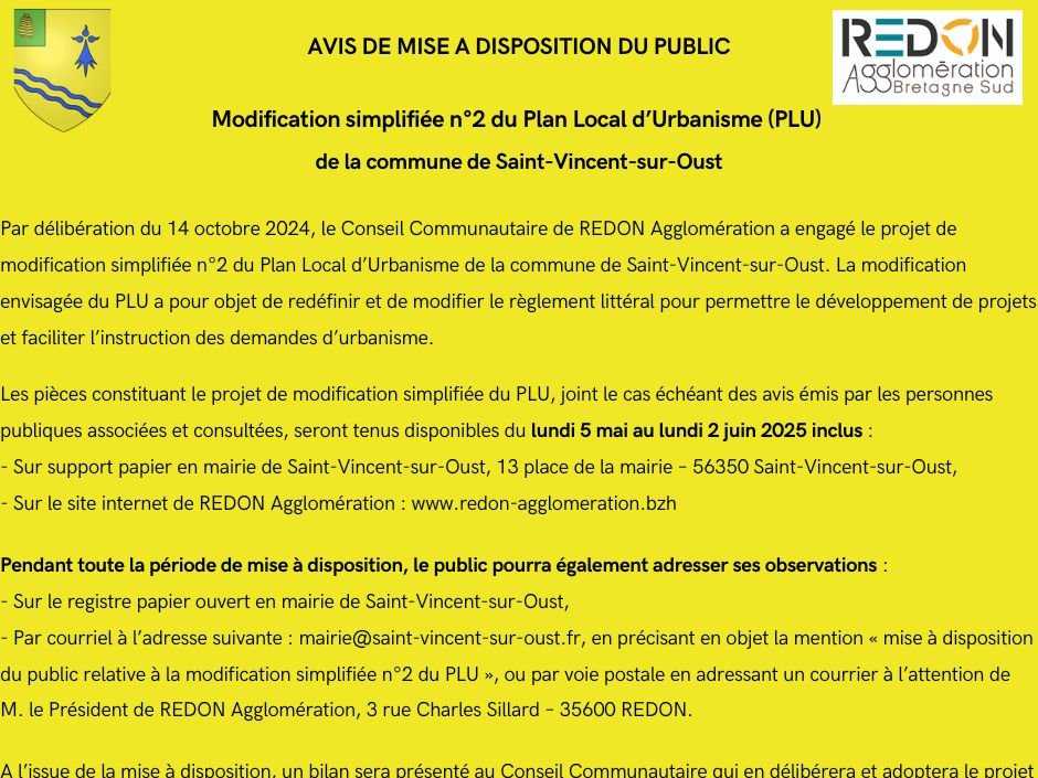 Modification du PLU de la commune de Saint Vincent sur Oust
