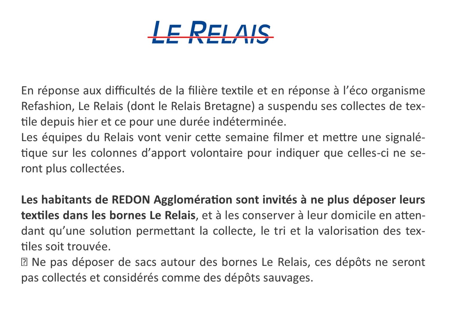 En réponse aux difficultés de la filière textile et en réponse à l’éco organisme Refashion, Le Relais (dont le Relais Bretagne) a suspendu ses collectes de textile depuis hier et ce pour une durée indéterminée.