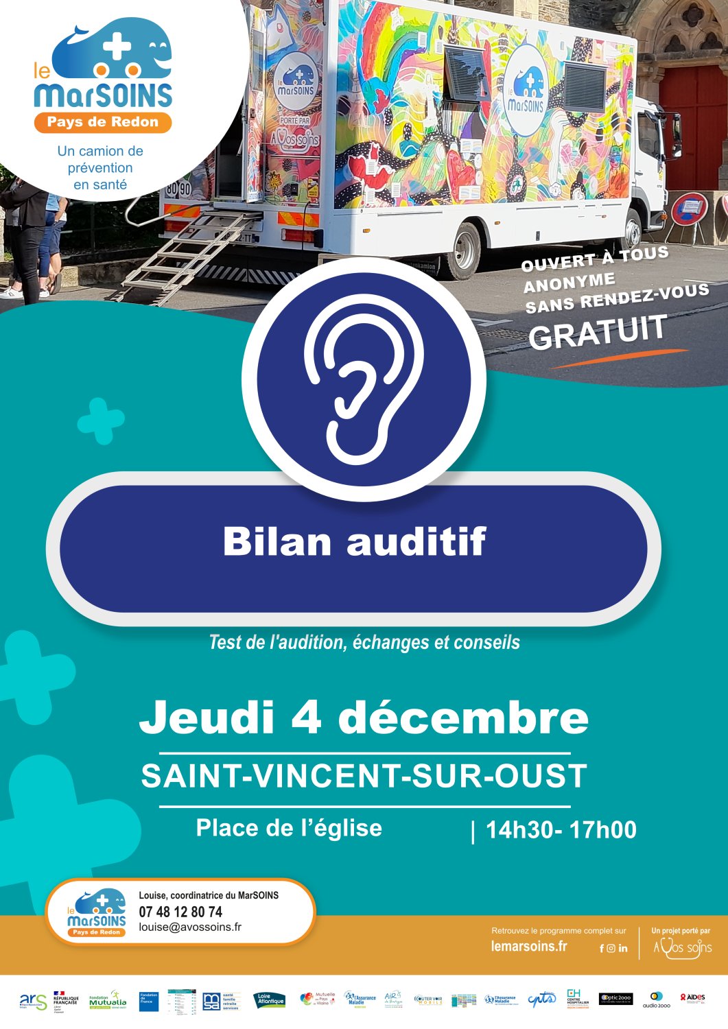 Bilan auditif Les Marsouins 4 décembre 2025 Jeudi 4 décembre de 14h30 à 17h00 Saint Vincent sur OustPlace de l’église Bilan auditif. Test de l’audition, échanges et conseils. Ouvert à tous, sans rendez-vous. Gratuit