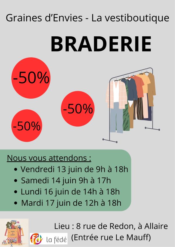 Braderie Graines d’envie du 13 au 17 juin 2025 Vendredi 13 juin de 09h00 à 18h00 8 rue de Redon Allaire