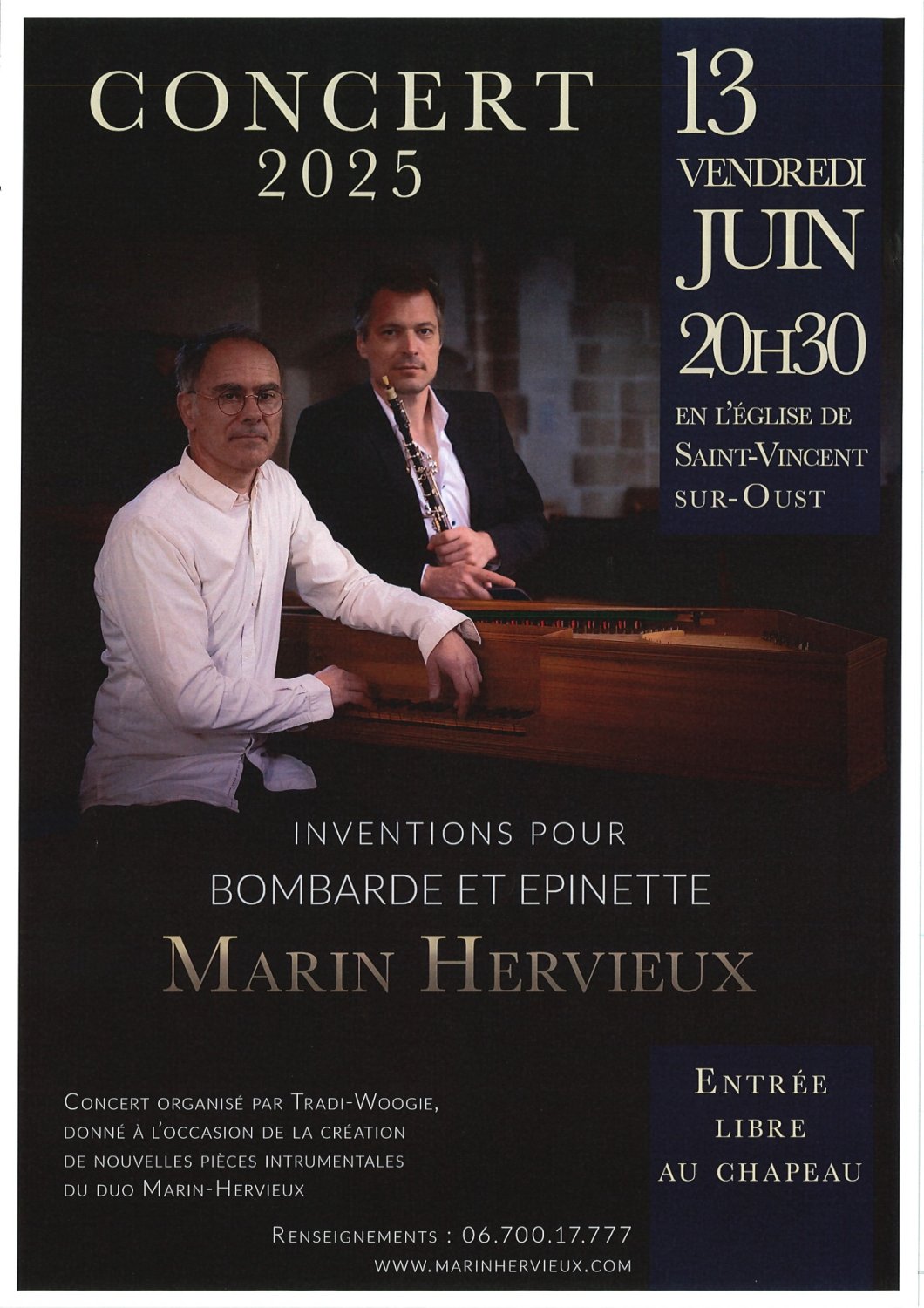 Concert de bombarde et épinette (Marin Hervieux) Vendredi 13 juin de 20h30 à 22h00 Eglise de Saint Vincent sur Oust Concert organisé par Tradi-Woogie, donné à l’occasion de la création de nouvelles pièces instrumentales du duo Marin Hervieux. Entrée libre au chapeau