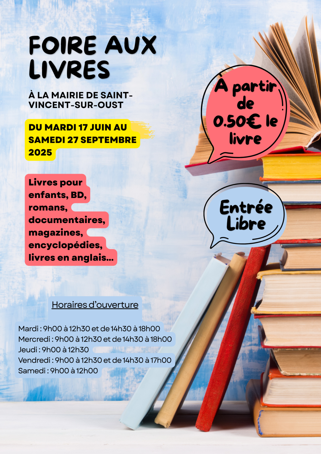 Foire aux livres Du 17 juin à 11h29 au 27 septembre à 12h29 MairieSaint Vincent sur Oust Livres pour enfants, BD, romans, documentaires, magazines, encyclopédies, livres en anglais...