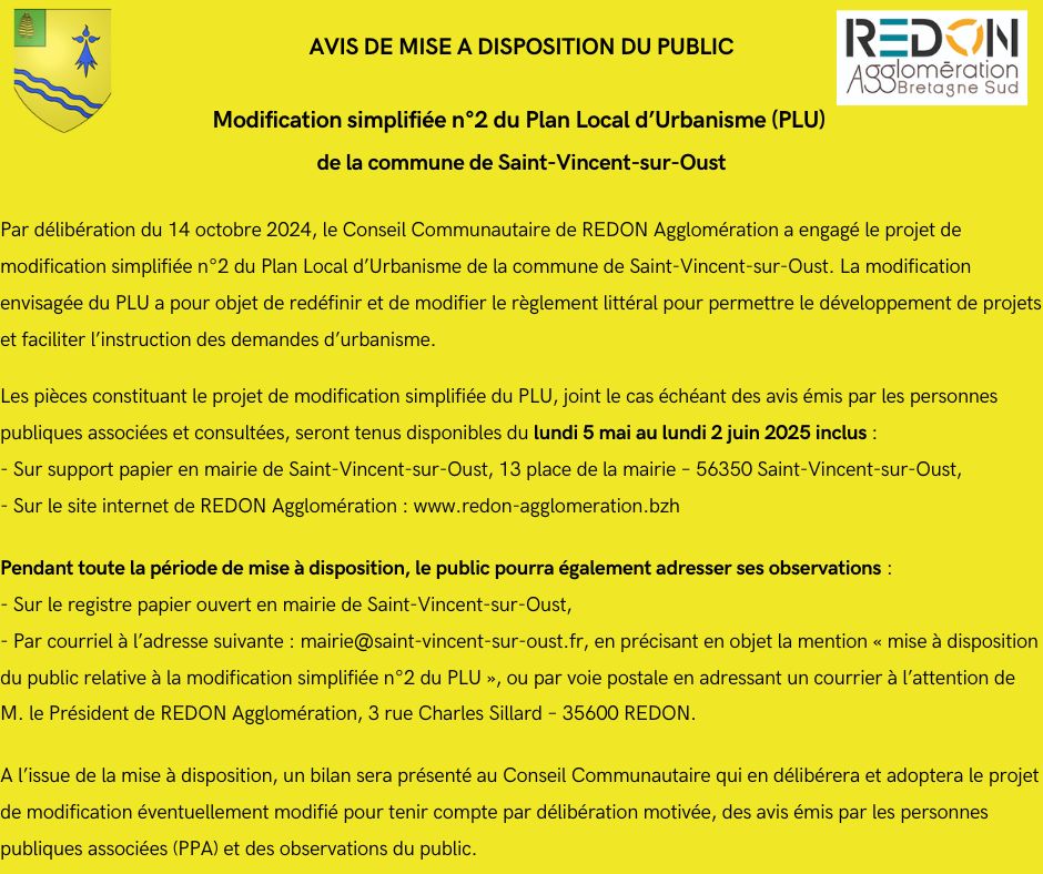 Modification du PLU Publié le lundi 5 mai 2025 Modification du PLU de la commune de Saint Vincent sur Oust