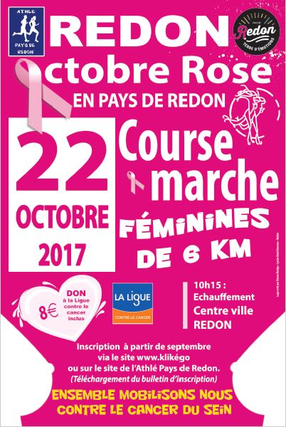 Octobre Rose Redon Publié le jeudi 3 août 2017 Mobilisons nous contre le cancer du sein. Une course ou marche féminines de 6km à Redon Affiche Octobre rose 2017