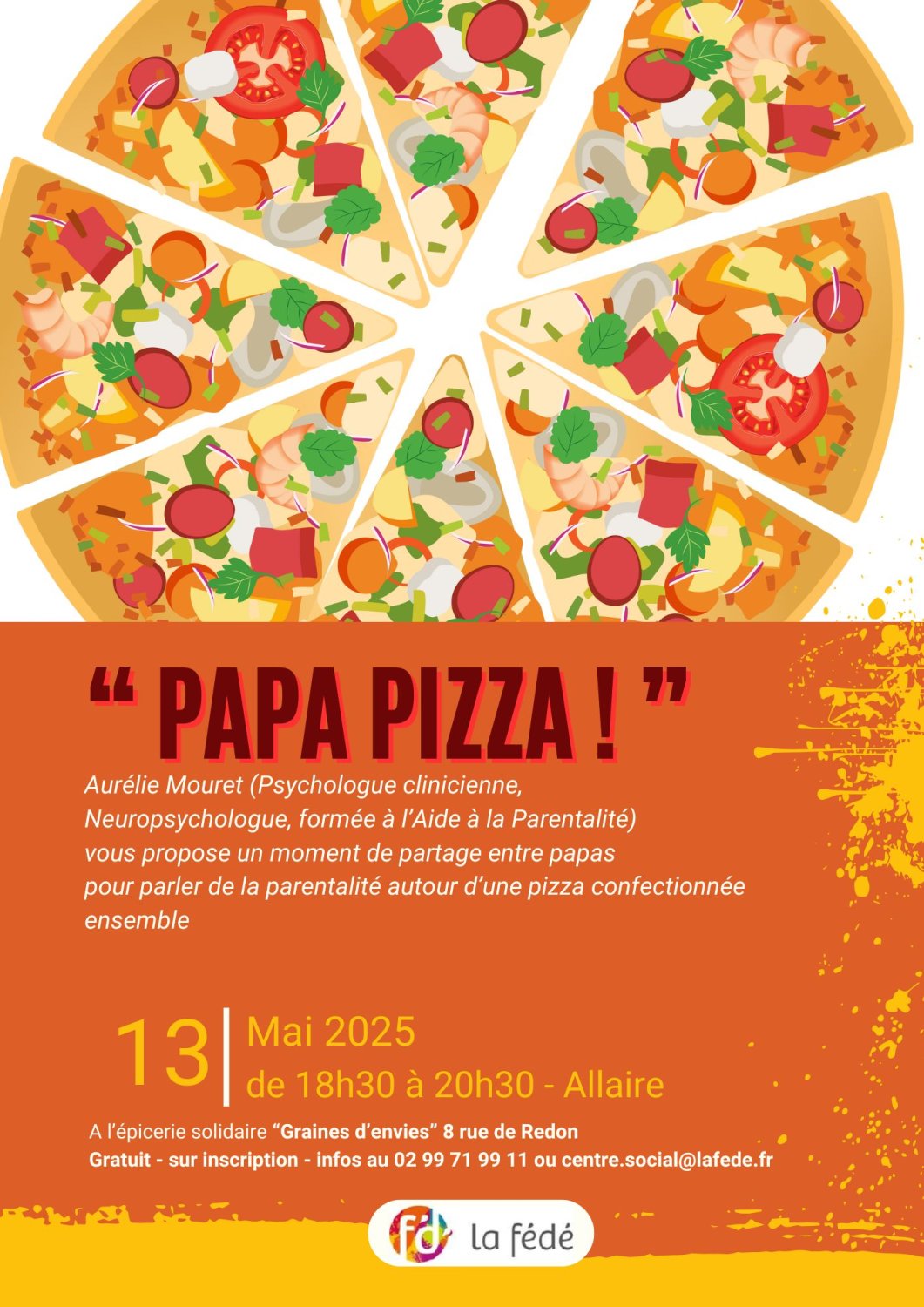 Aurélie Mouret (psychologue clinicienne, neuropsychologue, formée à l’Aide à la Parentalité) vous propose un moment de partage entre papas pour parler de la parentalité autour d’une pizza confectionnée ensemble.